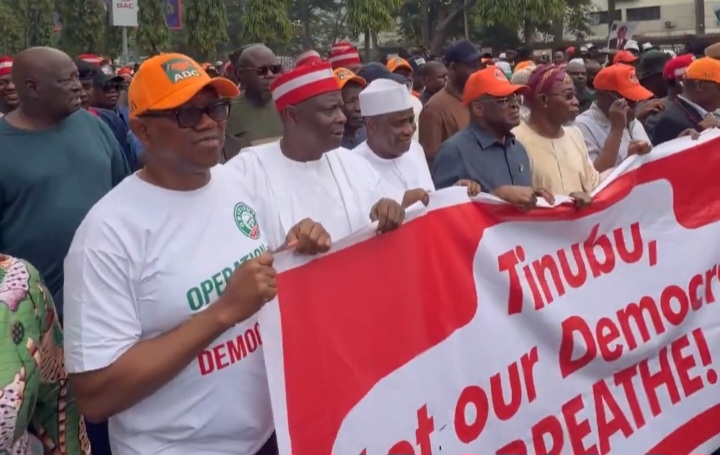 Prominent figures spotted at the protest and related press events included former Vice President Atiku Abubakar, Labour Party’s Peter Obi, New Nigeria Peoples Party’s Rabiu Kwankwaso, former Senate President David Mark, ex-Transportation Minister Rotimi Amaechi, and fiery activist Dino Melaye. Their presence lent significant weight to the demonstration, drawing crowds and media attention.Addressing supporters earlier, ADC leaders issued a three-day ultimatum to INEC: restore Mark and Aregbesola, issue a public apology for what they termed “partisan behaviour,” and respect the autonomy of political parties. Failure to comply, they warned, would trigger sustained nationwide civic action, including occupations of INEC offices across the 36 states and the FCT.